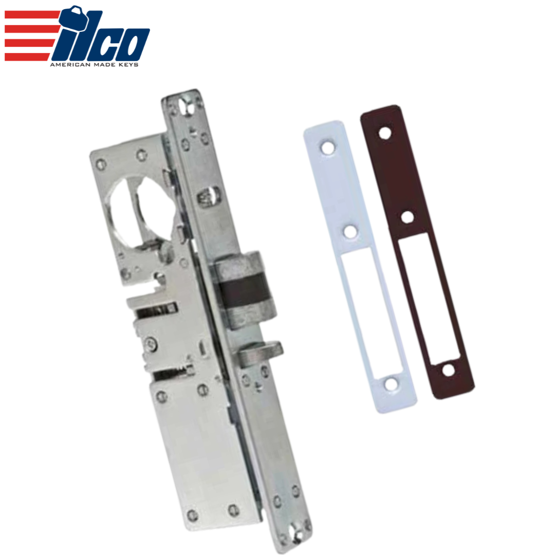 ILCO Deadbolt Mortise Lock Body 1 1/8" Backset, Individual Single Pack. No Handing. Flat Faceplate included with two finishes clear aluminum & Dark Bronze. fits aluminum stile doors. Five-ply laminated steel bolt with concealed hardened steel pin provides maximum security on single leaf doors.